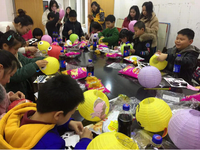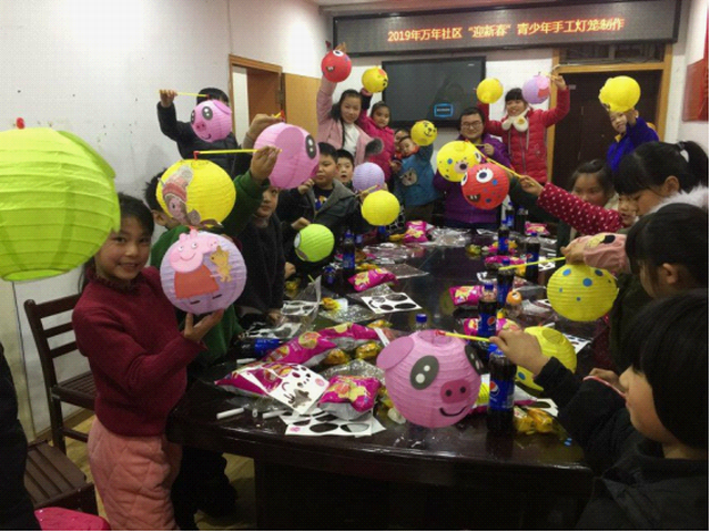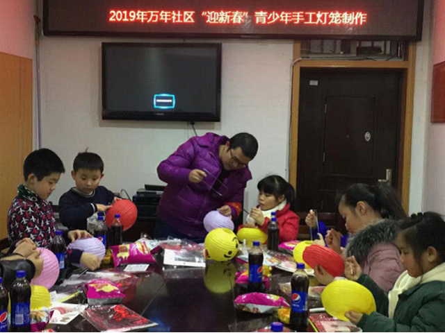 2019年1月18日,万年社区青少年活动空间热闹非凡,20余名小朋友在社区志愿者的指导下,充分发挥想象力,动手制作各式精美的灯笼。