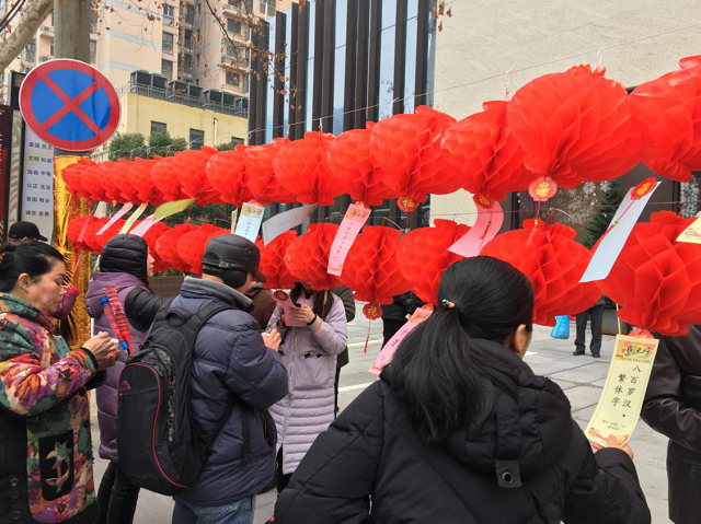 活动开始前,社区工作人员将准备好的200条谜语、灯笼挂在红绳上,营造出浓厚的节日氛围。