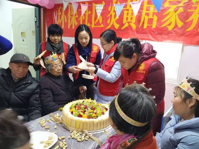 环保社区活动室内张灯结彩、热闹非凡,30余名党员和居民齐聚一堂,为社区高龄的老人举办集体生日会。上午9时整,“祝你生日快乐… …”伴随着温情的歌声,在众人欢乐的祝福声中,头戴生日帽的寿星们一起许愿,吹蜡烛,切蛋糕,场面热闹又温馨。随后,社区志愿者还为老人 表演了精心编排的节目。