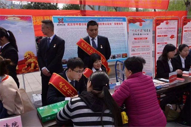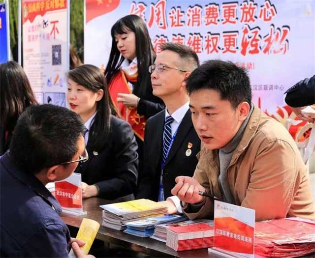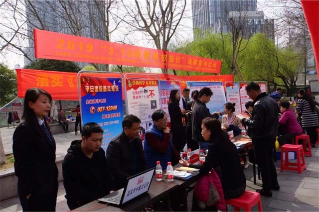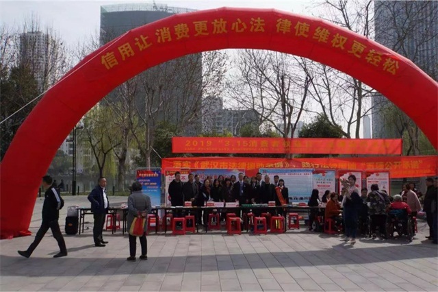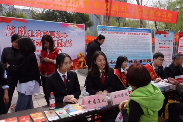 为迎接2019年“3·15消费者权益日”,武汉市中星公证处、江汉区人民法院、江汉区唐家墩街办事处、江汉区联调中心、江汉区唐家墩街司法所、湖北诺亚律师事务所等多家单位,在菱角湖公园管理中心的支持下,于3月15日上午在菱角湖公园开展了主题为“信用让消费更放心 法律使维权更轻松”的消费者权益日综合法律宣传活动。