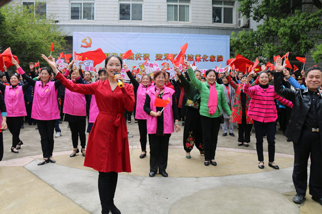 在悠扬的手风琴伴奏下,在场党员群众挥舞着小红旗,以快闪形式逐渐聚集到广场中央。大家一同合唱《我和我的祖国》,快乐的笑脸、高亢的歌声、轻快的舞步,表达出对伟大祖国的美好祝愿和对军运盛会的热切期盼。