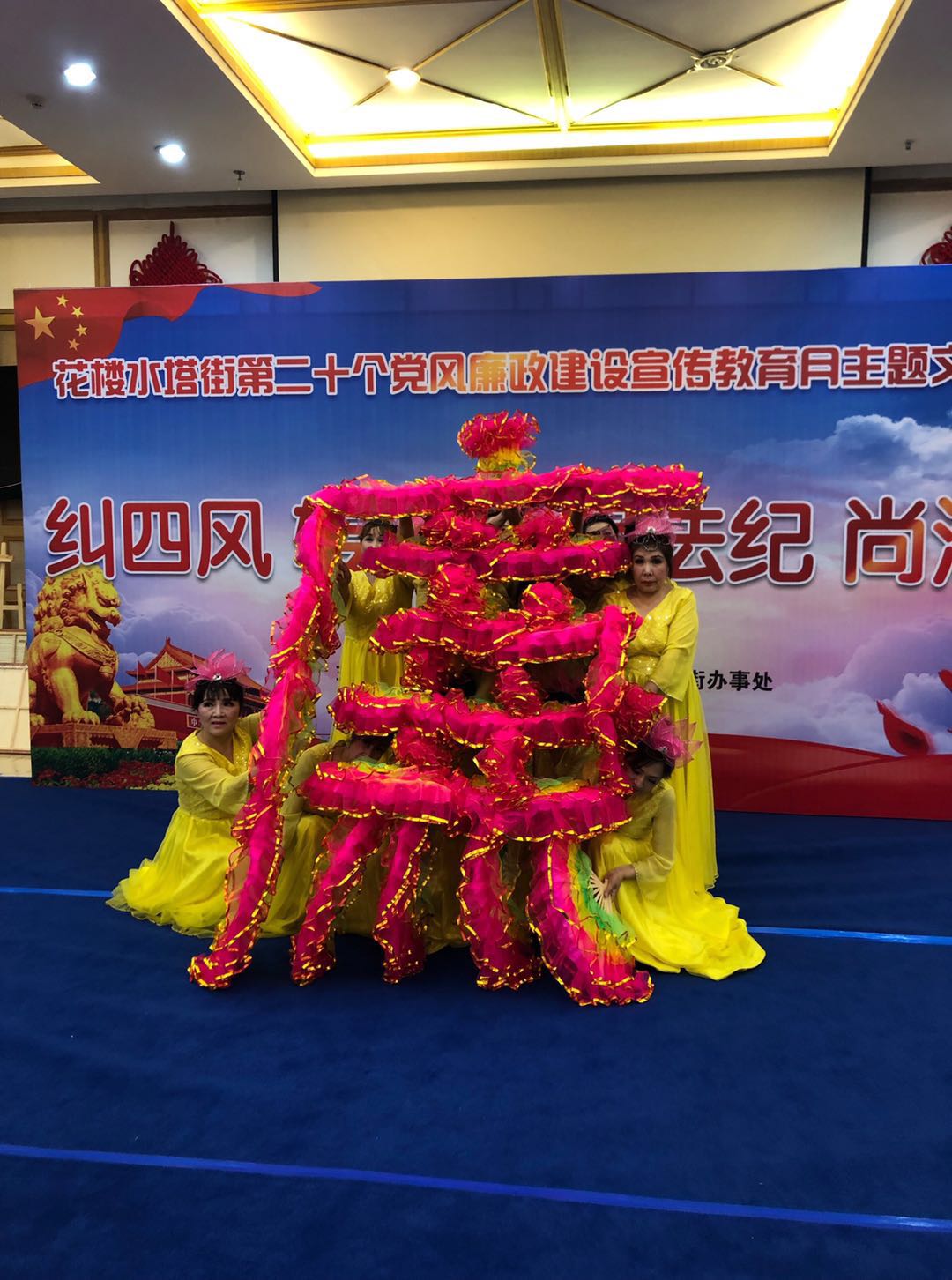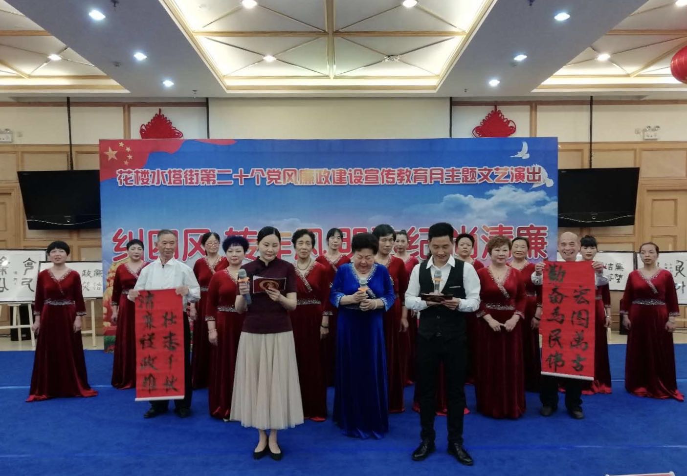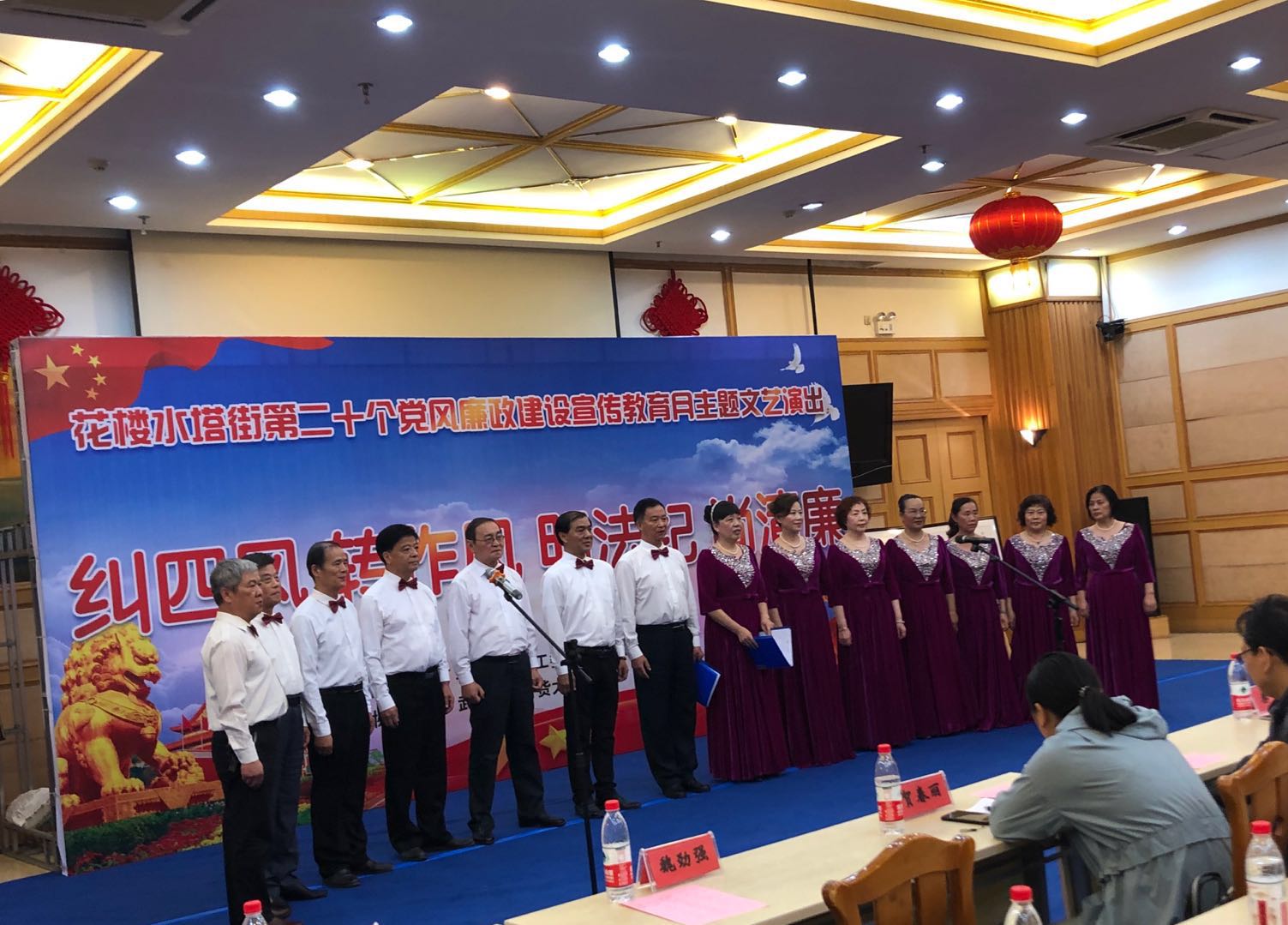 2019年5月15日下午,花楼水塔街在武汉中心百货大楼26楼会议室,以“纠四风、转作风、明法纪、尚清廉”为主题,成功举办了第二十个党风廉政建设宣传教育月主题文艺演出。演出活动邀请了区委常委、区纪委书记、区监委主任秦红,区委常委、区委宣传部部长胡娟和区纪委副书记、区监委副主任彭四海到场观看,街工委、办事处全体领导,街大工委9家成员单位领导,街“两新”企业党组织书记,街机关科室和站所队负责人及10个社区代表一共一百多人观看了演出。