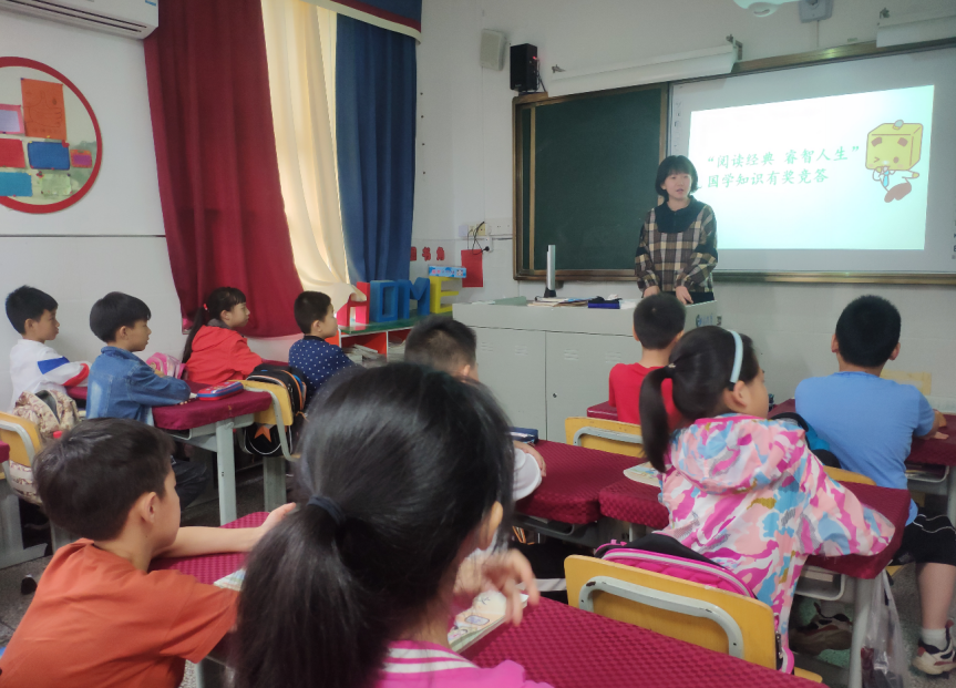 为提高学生国学文化水平,传扬经典国学文化知识,紧接着在教室内开展“阅读经典 睿智人生”国学知识有奖竞答,参加活动的学生回答出正确的答案就可获得一份精美的文具套盒。教室内,学生们热情高涨,纷纷转动自己的小脑瓜,迅速反应,踊跃举手答题,竞相展示丰富的国学知识。当遇到都答不上的难题时,老师便在一旁为大家讲解,既普及了国学知识,又能提高孩子们的综合素养,激发了学生们对国学学习的热情,深受大家的喜欢。