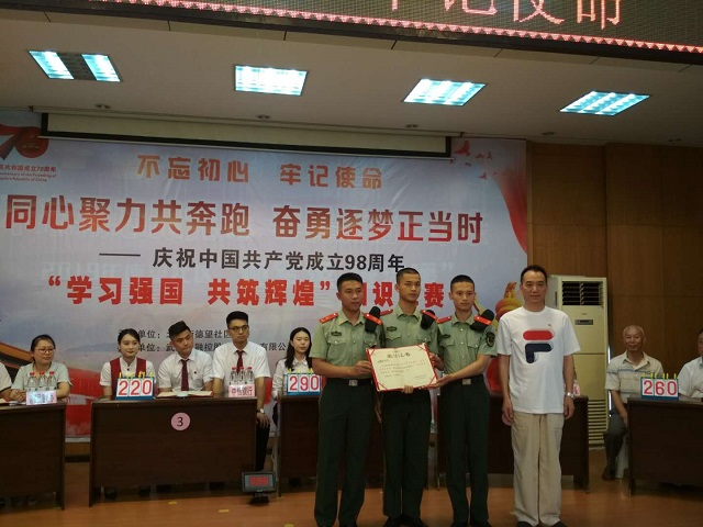 为进一步深入学习贯彻习近平新时代中国特色社会主义思想和党的十九大精神,庆祝中国共产党成立98周年,全面推进基层党组织的建设,夯实党组织堡垒工程,推动“学习强国”软件的广泛学习使用,6月25日,北湖街德望社区结合“不忘初心、牢记使命”主题教育,在天门墩中学报告厅举办“学习强国 共筑辉煌”知识竞赛,辖区共建单位中国人民银行营管部、金融控股集团、中信银行武汉分行、武警银行中队、建设局重点办以及辖区居民党员组成的6支代表队参加了此次竞赛。