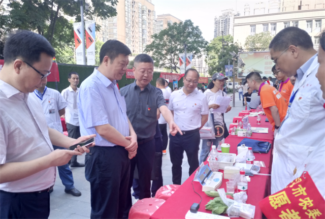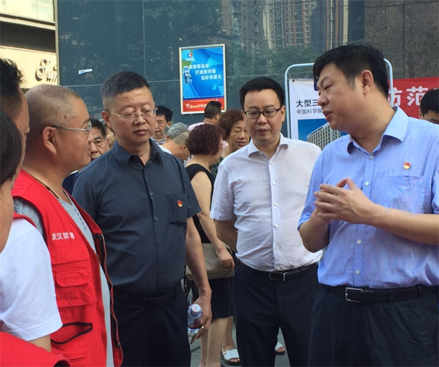 区长李湛,深入中心会场指导工作。李区长与现场来自不同领域的党员志愿者交流沟通。首先,李区长来到义诊台,当了解到武汉红十字会医院党委联合武汉协和医院组织23名专家坐诊咨询台,优抚医院和阿波罗医院组织专家名医前来参加志愿服务活动,为居民答疑解惑,他表达了对医院党员志愿者们的感谢,感谢红十字会医院、优抚医院以及阿波罗医院长期以来对街道工作的支持。接着,走到禁毒宣传台时,李区长询问了禁毒社工目前的工作情况,并提出希望每一位禁毒社工平时能多入户,真正做到“敲得开门、叫得出名、说得上话”。随后,李区长饶有兴趣的来到垃圾分类宣传点时,他咨询目前唐家墩街垃圾分类试点社区的推进情况。他指出垃圾分类是一项长期而艰难的工作,它不是一蹴而就的,我们要善于发现问题,善于解决问题,及时总结经验。在农产品监测点前,来自农委的党员志愿者为李区长讲解了食品检测的方法。在长城宽带宣传点前,李区长咨询了家庭宽带安装室内与室外走线问题,希望该公司在室外走线时,注重社区环境美观,合理共建共赢,为创建美丽社区尽一份力。走到法律咨询台时,李区长询问了社区司法协理员毕业院校,是否适应目前工作,同时还希望协理员在基层多学习,多锻炼,体现为民服务本色……李区长走过了每一个服务台,或倾听他们的声音,或为他们指点一二,用他独有的亲民方式表达了对每一位党员志愿者的关怀。