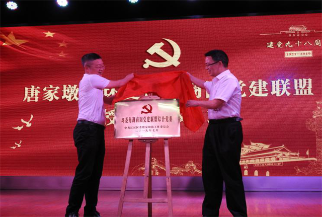 ▲区委组织部副部长、“两新”工委书记余志刚、唐家墩街工委书记耿世文为唐家墩街环菱角湖商圈党建联盟成立揭牌