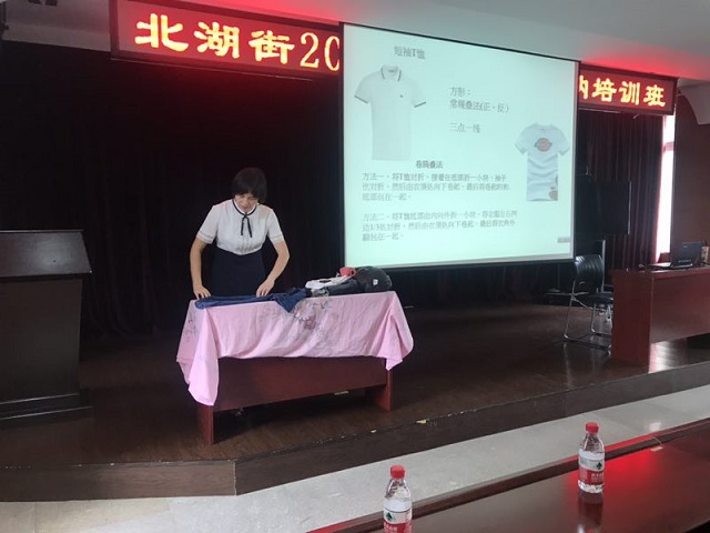 7月4日上午,北湖街开展第三期家庭收纳职业技能培训,培训课上,老师通过PPT的播放、跟居民们互动等方式,教授大家正确收纳家中物品。同时,在普及相关的理论知识后,老师手把手教大家怎样正确的折叠衣物,在实操演练的过程中,让居民们学到了整理衣服最实用的方法,整场教学氛围十分浓厚。一个多小时的培训让居民们受益匪浅,学习到了如何快速有序的收纳整理衣物。