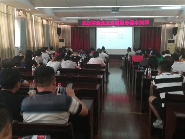 19日,唐家墩街在区人资局、市人防办开展以军运会基础知识、军运会场服务礼仪、军运文明礼仪等为内容的军运会志愿者培训活动。区人力资源局、区菱角湖公园管理中心、子湖实业公司、武汉市国资委、湖北省中西医结合医院、区城管执法局执法大队直属三中队等单位志愿者及社区军运志愿者共计220余人参与此次培训。