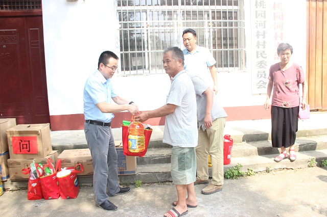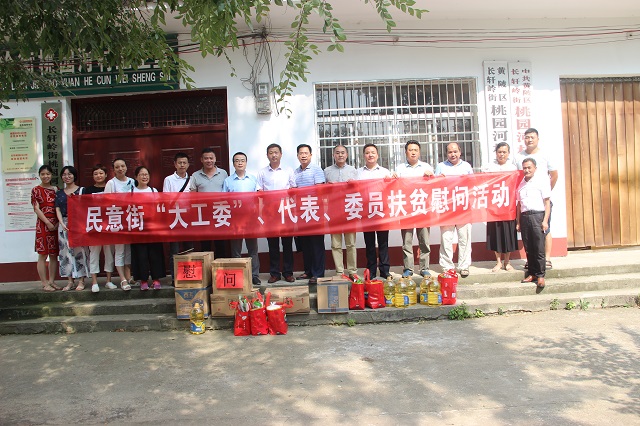 8月8日下午,民意街工委、人大代表以及社区书记等一行人来到黄陂定点扶贫村桃园河村进行扶贫慰问活动。在座谈会上,民意街详细了解了桃园河村的基本情况、扶贫进展情况以及即将推进的扶贫产业项目等,并就村里光伏发电产业发展过程中遇到的困难、扶贫更要扶志问题以及社区治理与乡村治理等基层治理问题进行了探讨交流。会后,街工委将带来的大米、食用油、绿豆、黑木耳等慰问物资一一发放到每一位贫困户手中,并希望他们树立脱贫信心,争取早日致富。