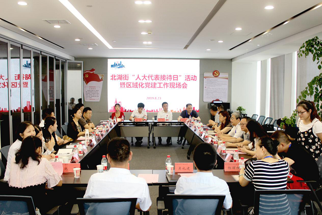 8月23日上午,北湖街“人大代表接待日”活动暨区域化党建工作现场会在广发银行大厦楼宇党群活动服务中心召开,会议由北湖街工委书记、人大工委主任(兼)胡丽华主持,江汉区人大常委会党组副书记、副主任张明华出席会议,北湖街人大代表、“大工委”兼职委员、辖区企业代表共计20余人参加。