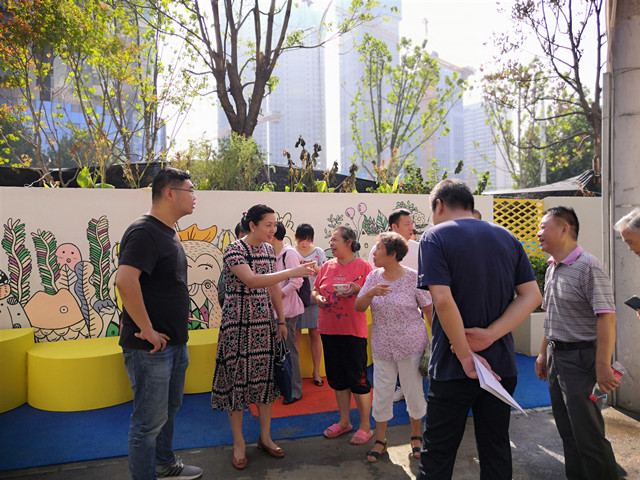 在座谈交流前,各社区书记首先参观了改造后的妙墩路18-28号小院,通过妙墩社区党委书记刘阳的讲解,大家了解到“‘妙’生活—齐思妙谈”项目的具体做法:社区工作者在城管队辅助下,拆除违章建筑后释放出公共空间,通过与江汉大学设计学院合作开展院落微改造,调动居民参与提供意见,在院内合理规划出休闲区、晾晒区、儿童游乐区等多个共享场地,对停车棚、大门及垃圾桶进行了设计修缮。目前居民们对社区的改变表示非常满意,下一步社区还将紧紧围绕红色物业工作,发掘社区居民骨干,形成“奇思妙谈”议事品牌,对目前小区遇到的停车占道等公共问题进行进一步探讨。