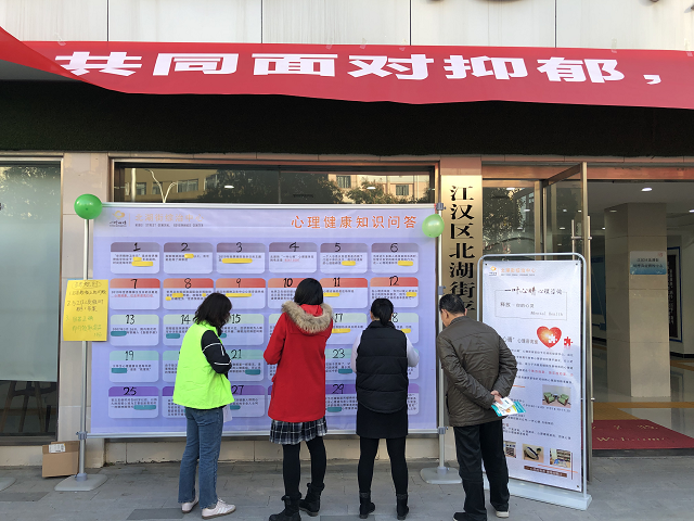 心理知识问答区。通过有奖答题的形式,加深居民对心理健康知识的了解、对抑郁症相关知识的了解。其中也包含“专为北湖街居民提供包括讲座、团体心理辅导和心理健康宣传在内的各种心理服务的机构叫做 一叶心晴 心理服务站”这样的题目,进一步扩大心理服务站的影响力。