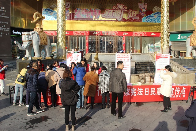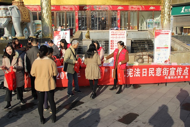 12月4日上午9时,民意街与辖区市场监督管理局、区房地公司、派出所、司法所等部门在汉正国际广场联合开展了“12·4”国家宪法日集中宣传活动。本次活动以“弘扬宪法精神 推进国家治理体系和治理能力现代化”为主题,通过悬挂条幅标语5副,展出宣传展板3块,发放宣传资料500余份、普法环保袋和普法书签各100余份、普法围裙和抱枕各30个,普法刨刀60个,提供法律咨询300余人次等形式,开展了以宪法为核心的国家基本法律和劳动权益保障、妇女维权、计划生育、低保、食品卫生、禁毒等与经济发展、服务民生相关的法律法规宣传,吸引辖区居民300余人参与,营造了良好的法治宣传氛围。