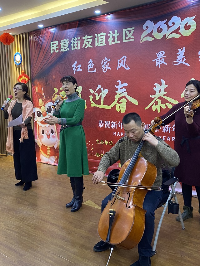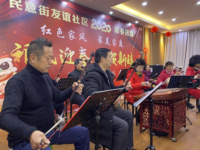 新春佳节来临之际,为了增强红色家风文化气息,培育文明风尚,宣扬最美家庭文化建设,民意街友谊社区联合至爱养老中心机构于1月7日上午9:30举办了2020年迎新春“红色家风 最美家庭”文艺汇演活动。出席本次活动的有民意街工委副书记艾青枝、老红军家人代表蔡七七、梦之蓝艺术团、红色旋律艺术团、周桂兰书画室的老师们。活动形式丰富多彩、精彩纷呈,包括歌唱表演《希望的田野上》、旗袍走秀《女人花》、乐器合奏《各族人民大团结》《拉住妈妈的手》、诗歌朗诵《春色满园》、手写春联等,共吸引辖区100余名群众积极参与。