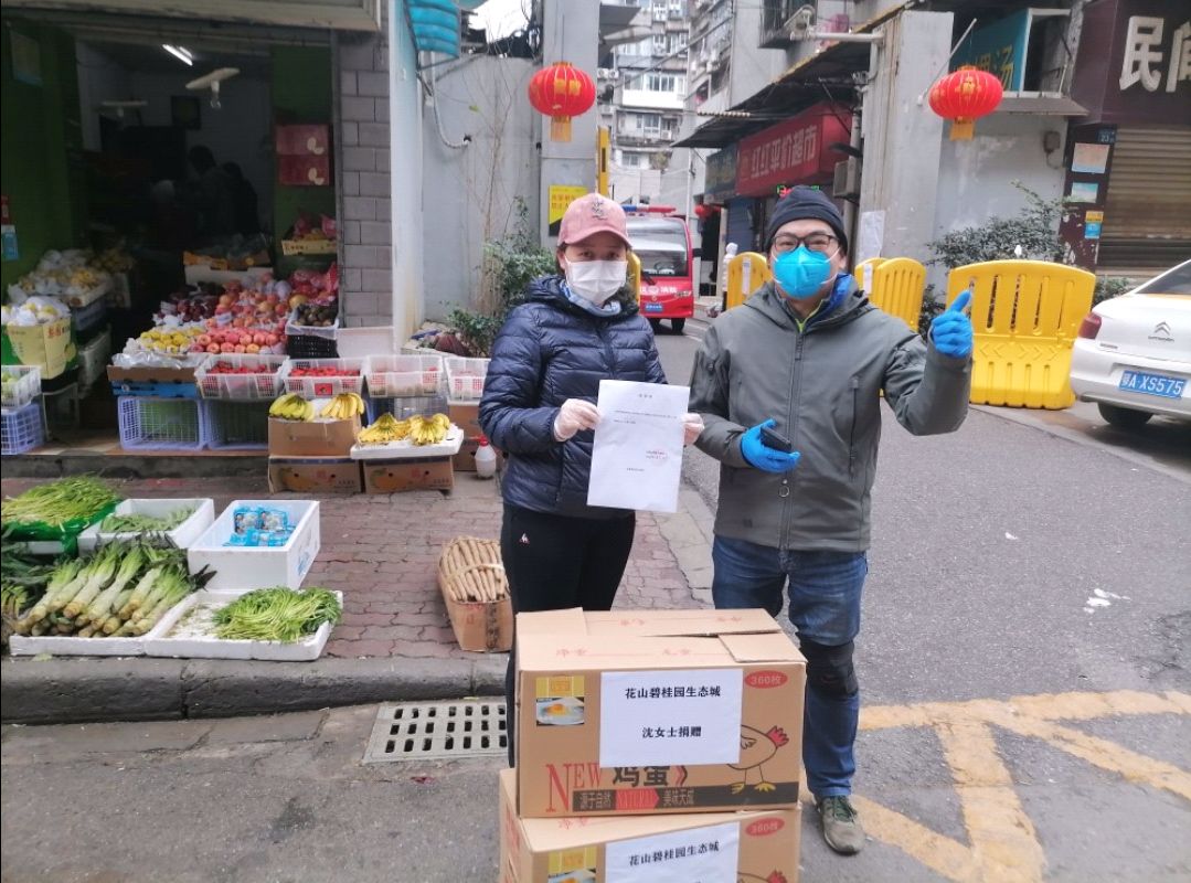 他们来了,物资更足了。他们自发形成志愿小团体,齐心协力为防疫一线筹措防疫物资。社区居民党员志愿者张群组织建立武汉市抗疫公益志愿者联盟,向社区定向捐赠防护口罩1000个;社区居民志愿者万润兰、曹庆牵头向花楼水塔街捐赠碗豆苗1吨、白萝卜3.5吨;社区居民志愿者喻轶珺发动公司向花楼水塔街捐赠精150公斤、手套600双;区个体户老板志愿者组织志愿小团体向花楼水塔街捐赠大米80袋、鸡蛋2箱。还有许多不知名的捐赠者,他们默默地把家中仅有的酒精或口罩等放在社区门前便转身离开。