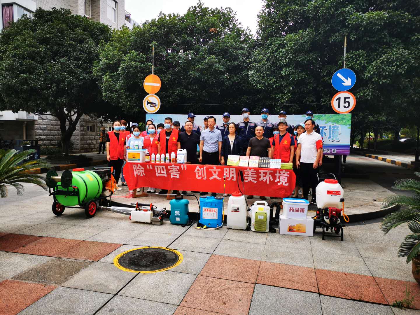 2020年9月11日上午9点,市爱卫办吴主任、钱副主任、区卫计委王副主任、常青街武装部长占杰、公管办主任蔡风雷、环卫所长黄友军、复兴村社区书记罗良忠、辖区志愿者等共50余人在航天花园小区开展“除四害,创文明