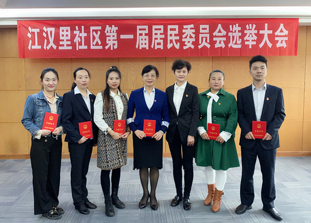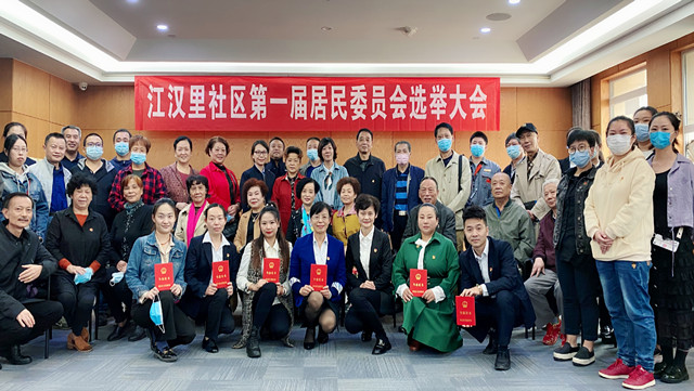 按照《湖北省居民委员会选举办法》规定的程序,江汉里社区第一届居民委员会选举工作从2020年8月25日开始,历时29天,依法依规先后进行推选居民选举委员会和居民选举监督委员会、参加选举的居民登记、推选居民代表和驻社区单位代表、候选人报名和提名、确定候选人等阶段,9月22日上午9:30江汉里社区筹备组组织召开江汉里社区第一届居民委员会选举大会。经系列规范程序,任莲芳等6名同志当选第一届居民委员会成员,江汉里社区第一届居民委员会正式成立。区民政局、汉兴街、辖区单位相关单位负责人和居民代表49人参加会议。