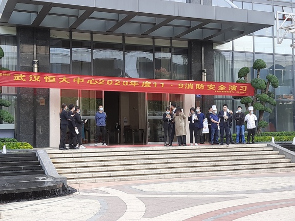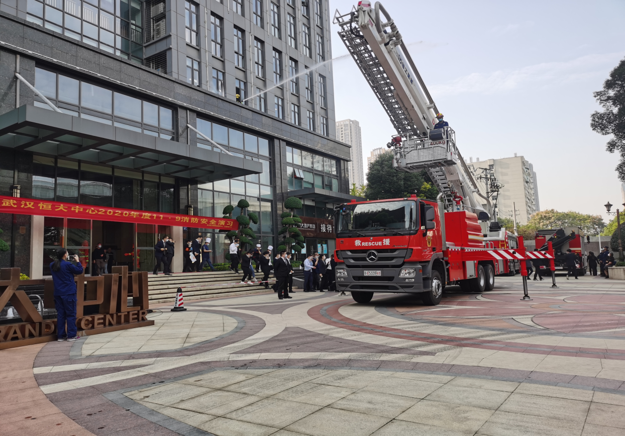 本次演练分疏散演练、灭火演习、消防安全培训等部分。按照演练方案,恒大中心因写字楼员工在楼道内吸烟引发火灾,产生大量浓烟迅速扩散,物业员工发现火情后,立即拨打119报警。物业人员立即启动消防应急救援预案,紧急进行火灾扑救工作,同时组织写字楼各楼层人员进行有序疏散。