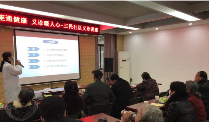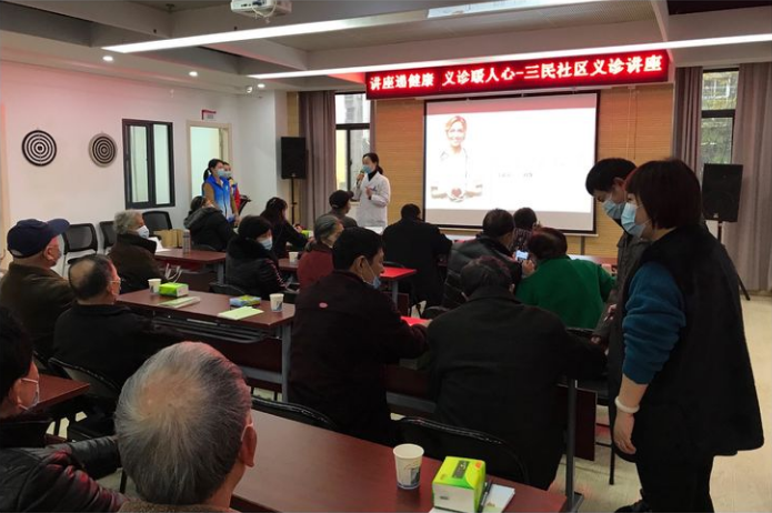 当前我国已进入老龄化社会,伴随着生活水平的日益提高,近年来糖尿病、心脑血管病等慢性疾病已成为威胁居民健康的重要杀手,而寒冷的秋冬季节正是老年人心脑血管疾病的高发季,为了倡导健康生活理念,普及养身保健知识,呵护老年人的健康,2020年11月24日,民权街道三民社区联合武汉市逸飞驻民权项目、湖北夏小中医院、武汉普瑞眼科医院开展了“讲座递健康 义诊暖人心”中医讲座义诊活动,三民社区35余老年居民及多名志愿者参加了本次活动。