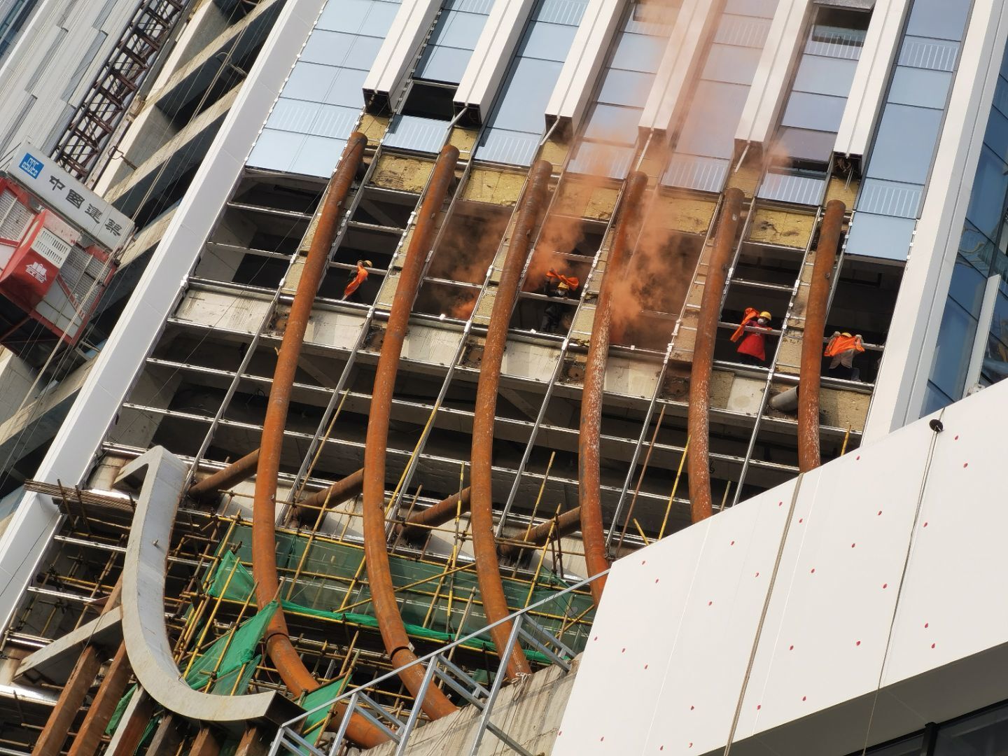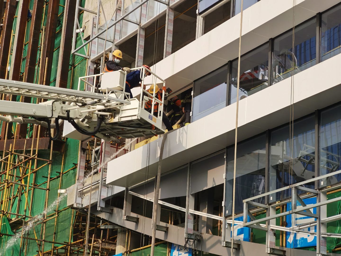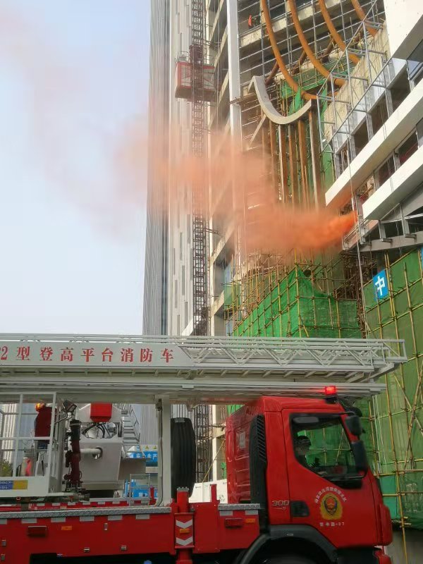 9时30分,演习正式开始,随着施工大楼冒烟、被困人员挥舞标识求救、工作人员报警后,一阵刺耳的警报声响起,多辆消防车迅速驶进现场进行灭火、救人等模拟演练。