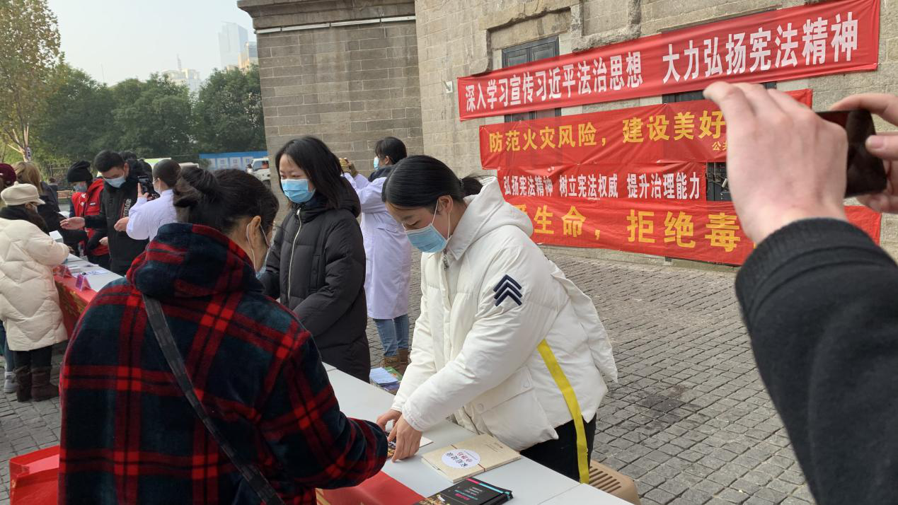 2020年12月4日上午,江汉路步行街区综合服务中心与文明共建街道花楼水塔街及社区共同开展“12 . 4”国家宪法日宣传活动。活动以宣传宪法精神为主题,在中山大道水塔下设宣传咨询点,为市民朋友宣传解答禁毒、教育、医疗卫生、民法典等相关法律知识。