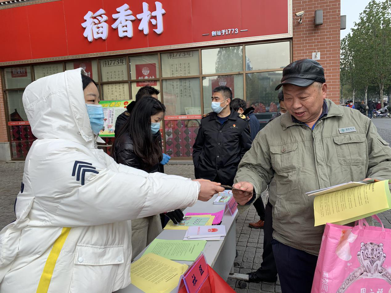 江汉路步行街区综合服务中心干部向市民发放宣传册