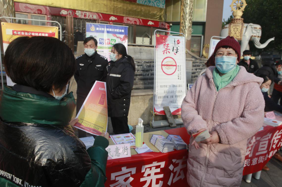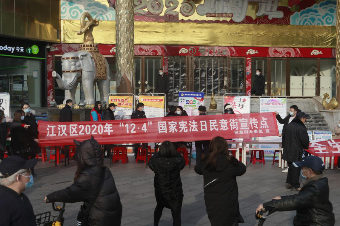 12月4日,民意街联合团区委、派出所、市场监督管理局、司法所、武汉金融街集团等单位在汉正国际广场联合开展了“12·4”国家宪法日集中宣传活动。本次活动以“深入学习宣传习近平法治思想 大力弘扬宪法精神”为主题,通过悬挂条幅标语5副,展出宣传展板10块,发放宣传资料2000余份,提供法律咨询50余人次等形式,着重宣传了习近平法治思想,特别是关于宪法的重要论述,以宪法为核心的国家基本法律、与居民生活密切相关的《民法典》、冬季疫情防控方面的法律法规以及未成年人保护等相关法律知识和问题,吸引辖区居民300余人次参与,营造了良好的法治宣传氛围。