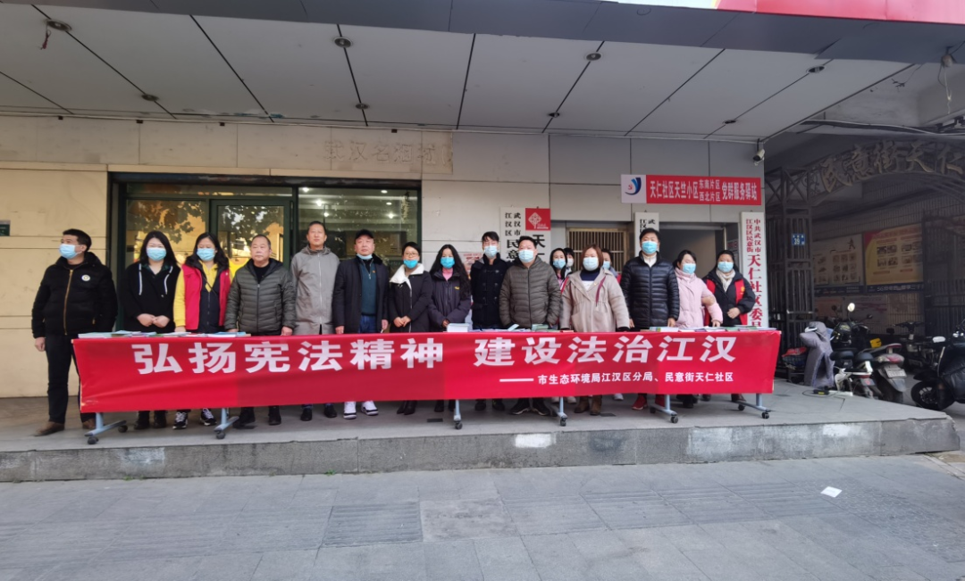 当天,各个社区也积极开展宪法宣传。天仁社区联合结对单位市生态环境局江汉区分局党员志愿服务队开展“弘扬宪法精神 建设法治江汉”宪法宣传进社区活动。通过分发政策法规宣传册,现场讲解民法典法条条例,重点宣讲了《宪法》、《民法典》中关于处理物业管理、居民纠纷及常态化疫情防控等一些法律规定,并针对居民群众关心的热点法律问题进行面对面详细地答疑解惑。