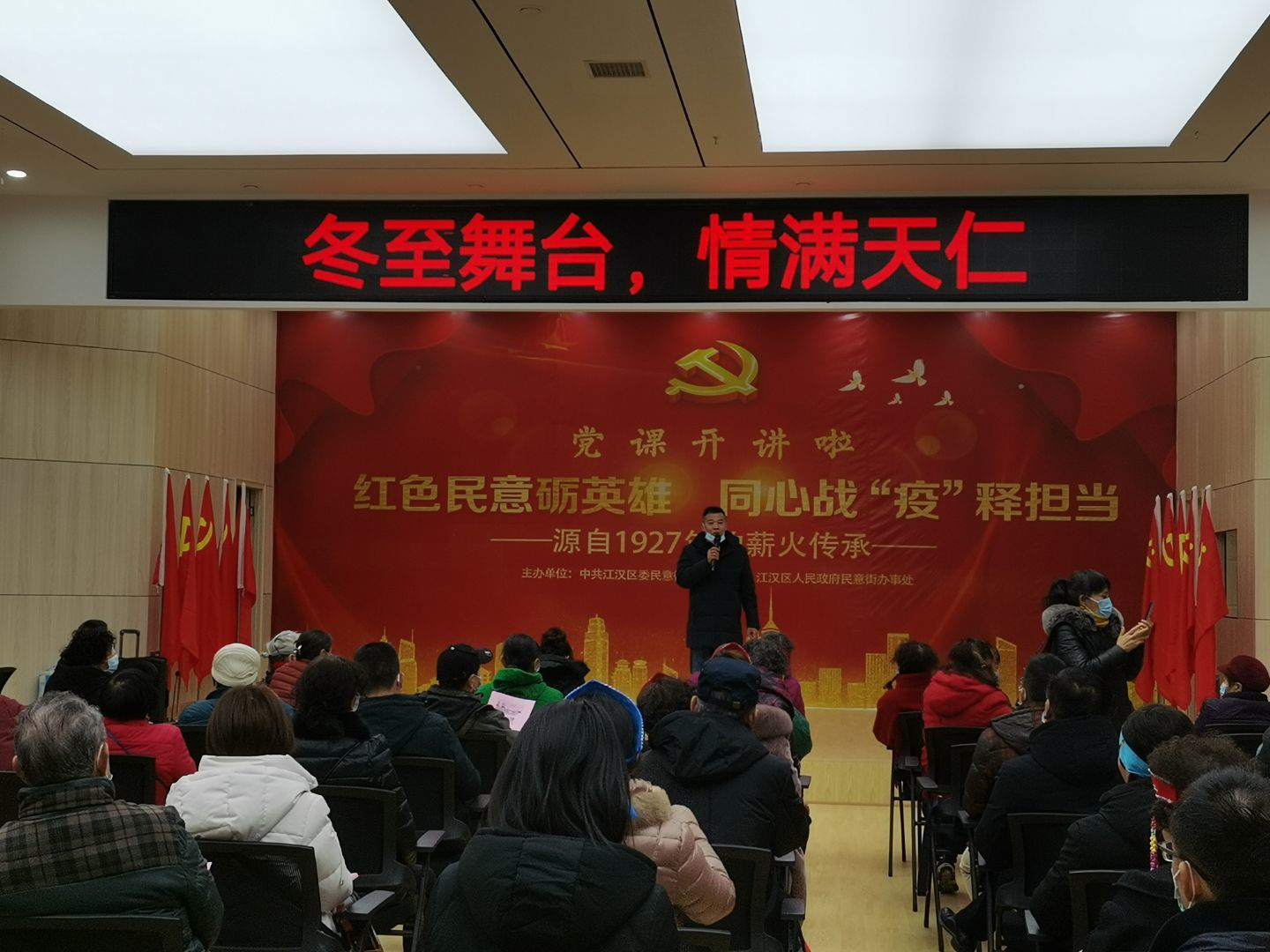 冬日里,冬日寒,不知不觉冬至来;吃饺子,放声歌,大伙庆祝来年欢。伴随着冬日暖阳,我们迎来了一个古老的节日——冬至,为了进一步弘扬中华民族传统民俗文化,也让大家感受到来自集体的温暖与团结,2020年12月21日,在这个寒意阵阵的冬日里,民意街舞台社区、天仁社区携手民意街逸飞社工、武汉普瑞眼科医院、武汉市夏小中医院、武汉存济口腔医院以及久久畅游旅行社共同举办了一场“冬至舞台,情满天仁”联欢会,让大家相聚在一起,共同品味节日的温馨,体会冬至的热情,为辖区居民送上一份暖心的祝福。