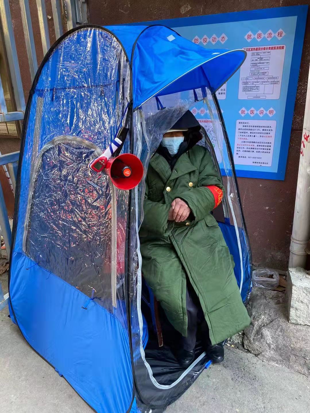 寒冬腊月,武汉最低温度达到零下6度,常青街10个社区志愿者24小时坚守在值守岗位。常宏里社区副书记郑万青看在眼里,疼在心里,自费为小区值守志愿者配置专属小帐篷:“他们真的很辛苦,大帐篷用的时间久了漏风,里外一个温度,早上去换班他们的手脚都是冰凉的。志愿者为社区防疫作出了极大贡献,希望爱心小帐篷能够让他们感到‘温暖’。”