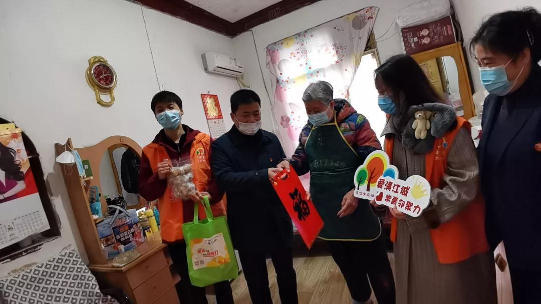 “非常感谢你和家人能响应政府提倡的就地过年号召,不能回到老家我们也希望能让你和家人在这里过个快乐的春节。”社区李书记对每一位就地过年的务工人员说,并向他们表示了问候。同时“爱满江城·常青邻聚力”项目社工和李书记为就地过年的务工人员送去了新春对联、油以及象征着年味的肉圆子和藕夹。