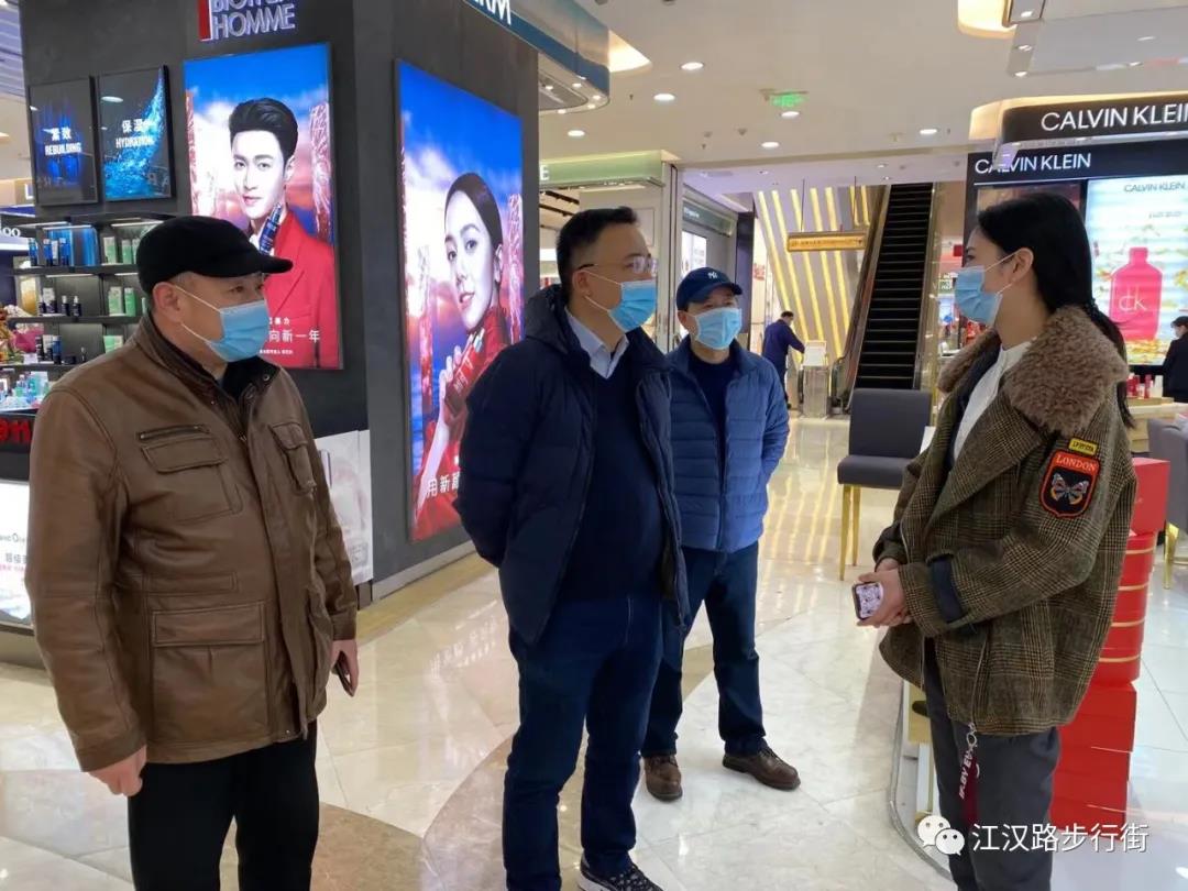 春节期间,江汉路步行街区综合服务中心加强联络,做好服务,全力保障街区舒适和谐。按照疫情防控常态化工作要求,服务中心积极联系街区商户继续做好量体温、戴口罩、扫绿码等防疫措施,督促检查了大洋百货、王府井等节假日安全工作。