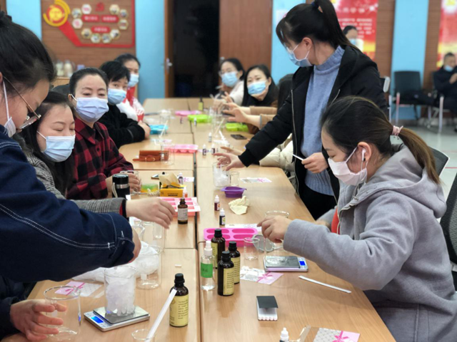 活动一开始,来自市妇干校的冯老师就给姐妹们分享了生活中常见的各种精油香氛。 随后,老师围绕手工皂的相关内容给大家进行了知识科普,让大家了解到手工皂与市场香皂、洗衣皂的区别。她通过示范操作,给大家演示了手工皂制作流程及工具的使用方法。随后,大家开始自己动手,个性化制作自己的专属精油香皂。 在等待手工皂成型的空隙时间,老师还和大家分享了精油减压技巧,现场积极互动,与冯老师交流自己的相关感受。