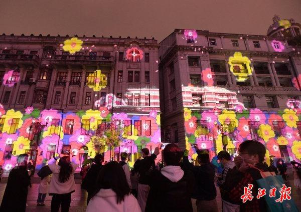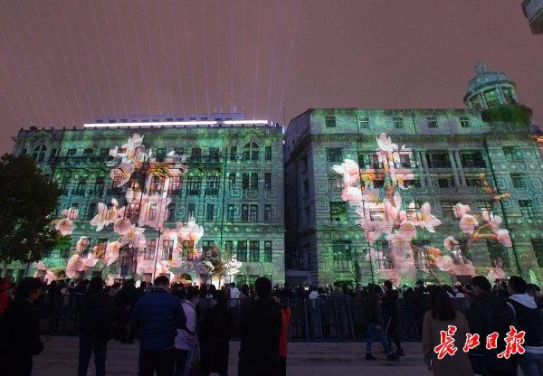 晚7时,当江汉关钟声敲响,老房子立面幻化出黄鹤楼的画面,樱花花瓣、白鹤一一呈现,大家纷纷拍照留念。