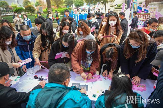 逛市集的快乐,当然不能只局限于现场,一定要和远方的亲朋好友分享。在“中国邮政主题邮局”摊位上,记者看到这里除了可以买到今年特别发行的手绘樱花主题纪念封和明信片,还可以在这里现场写下想说的话,寄给远方的朋友,此外还能免费盖上专为本次市集设计的纪念戳,记者注意到现场专门设置了“樱花邮筒”,来自武汉理工大学的周欢就买下了一组樱花主题的纪念封和明信片准备寄出去,她说:“这些明信片很有武汉特色,我准备等会儿贴上邮票后寄给老家重庆的朋友们。”