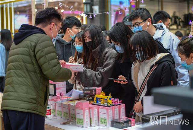 在”美好之物”摊位上,武汉立体拼图、樱樱爆米花、樱之城磁吸套装礼盒、樱之城磁吸徽章、有求必樱樱花福袋五款限定产品因制作精美、独具特色吸引了众多市民驻足问价,创始人张晖告诉记者,这些和武汉有关的文创产品的设计全部出自清华大学美术学院的毕业生们,因产品全部带有武汉气息,产品也大多都是武汉的地标性建筑或武汉美食等,所以卖得非常好,“才短短几个小时,基本上都卖空了。”张晖笑着说。市民谢先生一眼就看中了“长江大桥”图案的冰箱贴,“我觉得很有武汉特色,做得也很精美,买回去送人也很不错。”