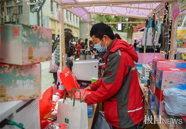 而在京东物流的定制樱花包裹摊位上,你可以把在集市上买到的心水好物打包好,用超美手绘樱花快递盒寄给远方朋友。其中每天前50名寄快递的小伙伴,还可以享受免费寄递福利。京东摊位负责人王梦圆说:“我们专门为这次的樱花主题市集设计了樱花快递盒,大家可以把买到的商品从我们这里直接寄出去,十分方便,这些也都是为了提升客户的购物体验。”