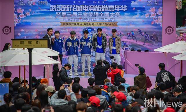 除了逛吃购物,这次市集还是武汉电竞爱好者的热闹聚会。3月20日,由120支战队报名的 “王者荣耀”第三届全国大赛·武汉樱花主题海选赛在市集现场开赛,赛程持续一整天。比赛区域布置成浪漫樱花风格,现场观看的市民里三层外三层把现场是围的水泄不通,在 “樱花树下”围观大神同台竞技。