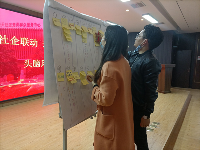 云天社区辖区内各类综合楼宇共13栋,两新企业集聚。为做好集聚区内“党建引领、融企赋能”工作,持续优化营商环境,更好地为企业提供精准服务,此次活动邀请了华中师范大学袁方成教授,打破了传统“1对1”的走访方式,采取轻松愉快的“头脑风暴”形式,共讨论出企业及员工需求26项。同时,各企业也积极分享自身能提供的资源,如提供活动场地、赋能培训讲座、线上学习直播等。