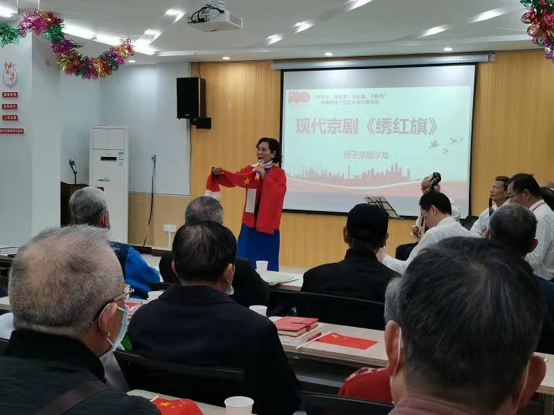 听京剧,“京“彩纷呈。活动将党史学习与红色京剧相结合,由扬子京剧沙龙为大家带来现代京剧江姐中的选段《绣红旗》拉开了今天情景党课的序幕。通过《绣红旗》这一段脍炙人口的红色戏曲唱段表演,让党员在经典传唱中感悟党的光辉历史,精彩的表演赢得了现场阵阵掌声。