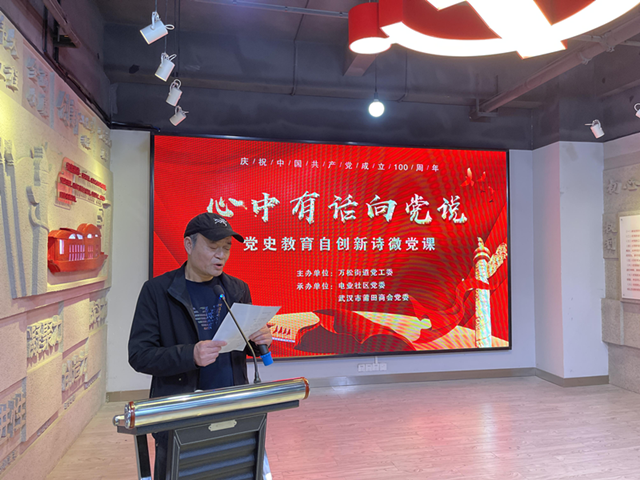 4月21日,万松街道“心中有话向党说”党史学习教育在电业社区党群服务中心举行,电业社区党员、街道辖区“两新”组织武汉市莆田商会党员、电业社区共驻共建单位党员代表等百余人参加了此次党课学习。街道三级调研员胡志雄自创了6首新体诗,为在场党员上了一堂生动的党史教育课。