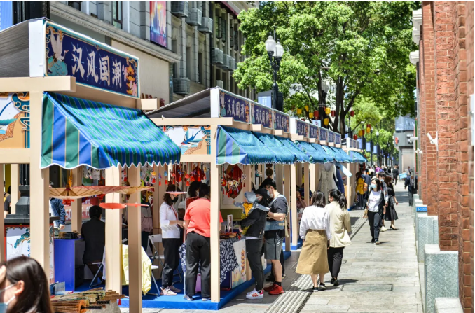 与启动仪式同步,武汉市文化和旅游局在江汉路步行街举办“汉风国潮”文化和旅游消费文旅市集。时间从4月29日一直持续到5月5日。
