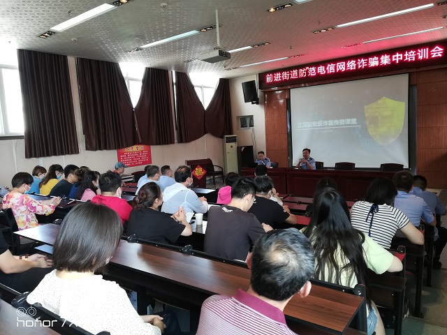 针对目前电信网络诈骗犯罪案件高发、形势严峻的情况,为提高社区工作人员、辖区学校、物业公司、酒店工作人员的防范意识和识骗防诈能力,6月4日,前进街道联合前进派出所开展防范电信网络诈骗集中培训会。前进街道办事处班子成员、街机关党员干部、各科室工作人员、社区全体工作人员、学校、酒店及物业公司代表等100余人参会。