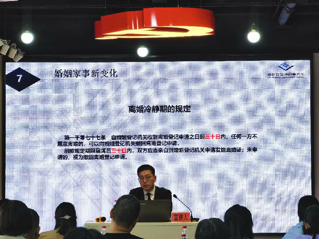 “2020年空巢老人赠送保姆巨额财产的案例非常多,老人可以为保姆设立居住权,民法典也赋予了赠与人有效时间内的撤销权,我们呼吁老年人不要随意赠与护理人员贵重物品”、“2021年一季度离婚率下跌超70%,离不开离婚冷静期制度,整体利大于弊”、“民法典解开了套路贷的各种套路”……周律师用一个个具体的案例深刻解读了民法典带来的现实影响力,为参会人员理解民法典法条规定提供了专业的理论支撑和丰富的观点参考。