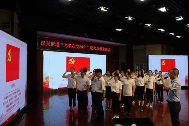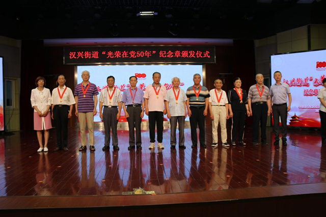 6月22日上午9时,江汉区汉兴街道在红领巾小学学术报告厅举行“光荣在党50年”纪念章颁发仪式,街道成员一起向30名50年以上党龄的老党员代表颁发“光荣在党50年”纪念章。