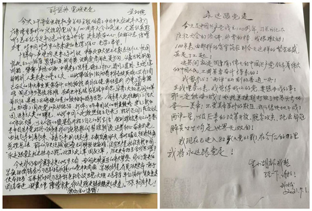 许多年长的党员在观看庆祝大会后,奋笔疾书,写下心中感怀。青年时期告别家人深入戈壁滩核基地,隐姓埋名二十余载,退休后又继续服务社区发挥余热的82岁党员刘佑俊,在心得中写道:“我是曾参与“两弹”研制的普通一兵,我觉得我们的党,要想办成的事,一定能办成!入党63载,我将永远跟党走!”航侧社区居民党员戴红军观后,即兴赋诗一首:“庆建党百年华诞感怀——京城盛会喜空前,举国庆党百华诞。红船贤聚初心铸,使命担当换新天。从严治党风气正,人民至上民富安。百年恰是芳华日,再奔征程逐梦圆。”