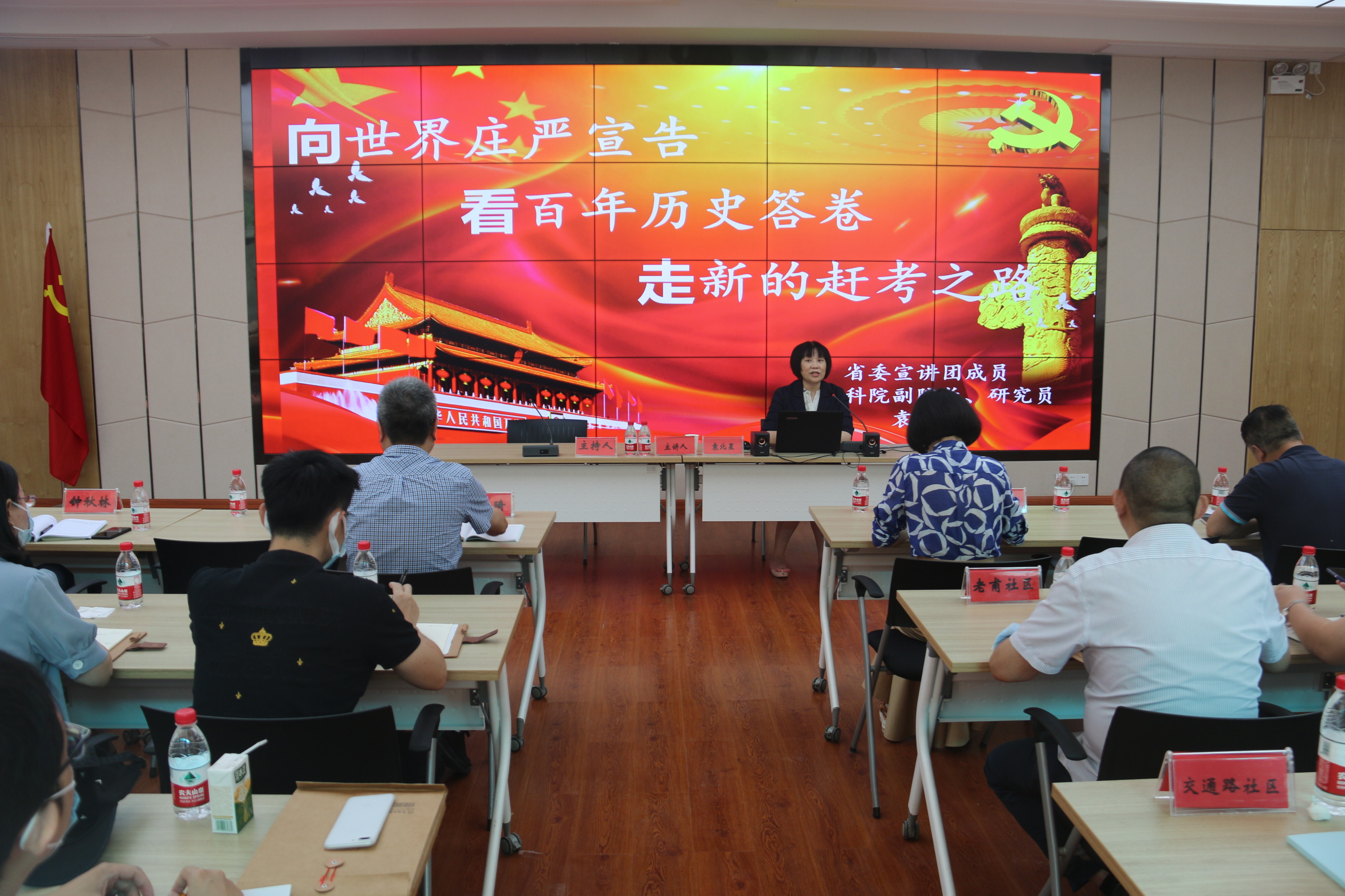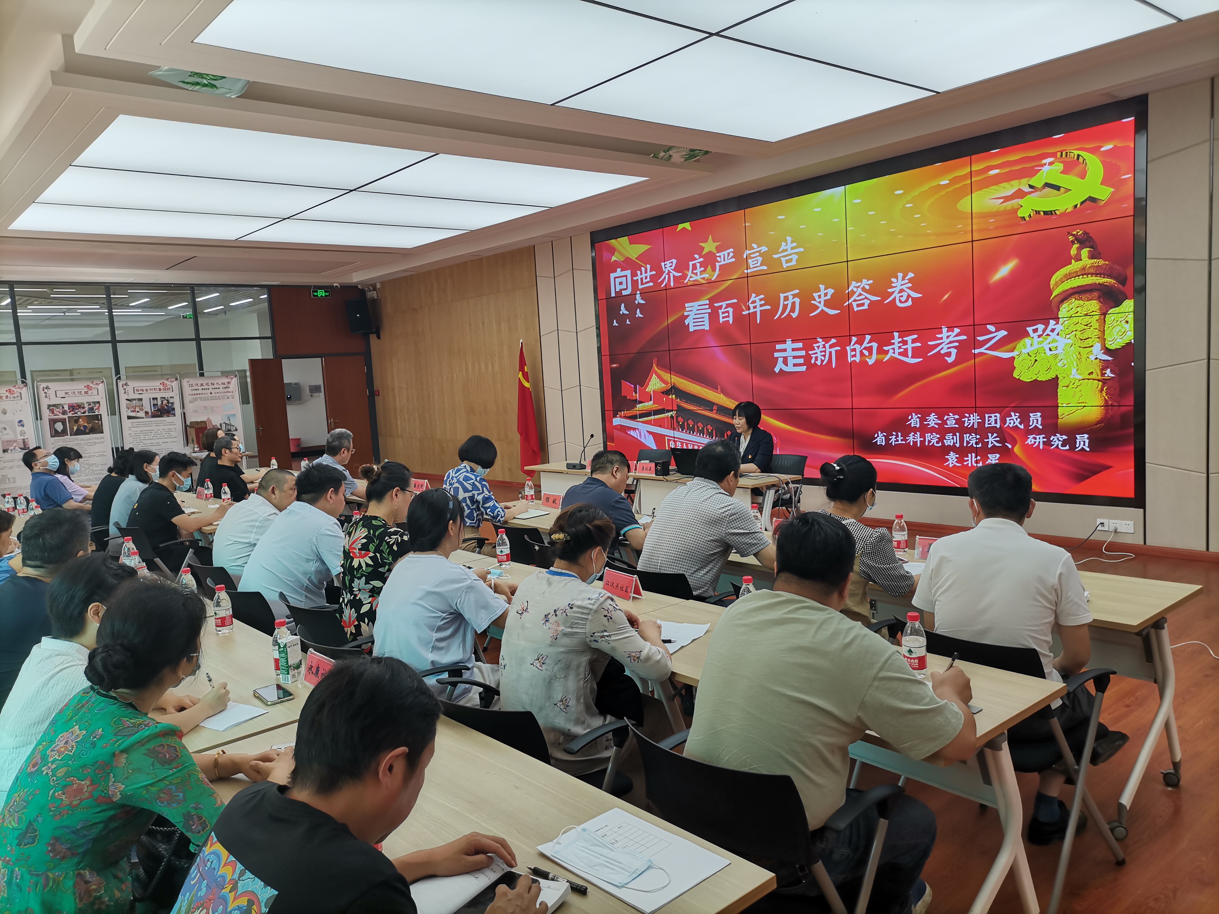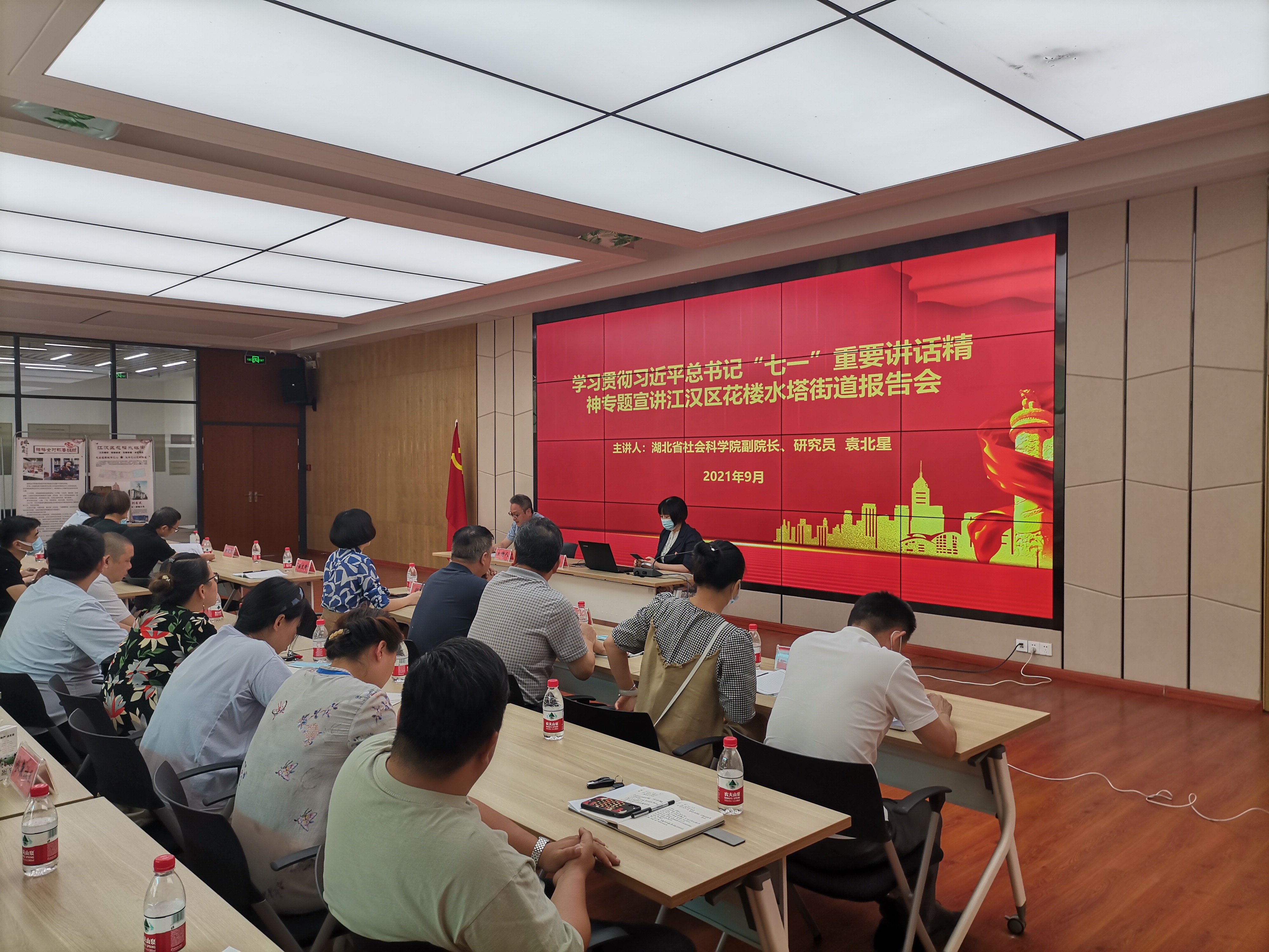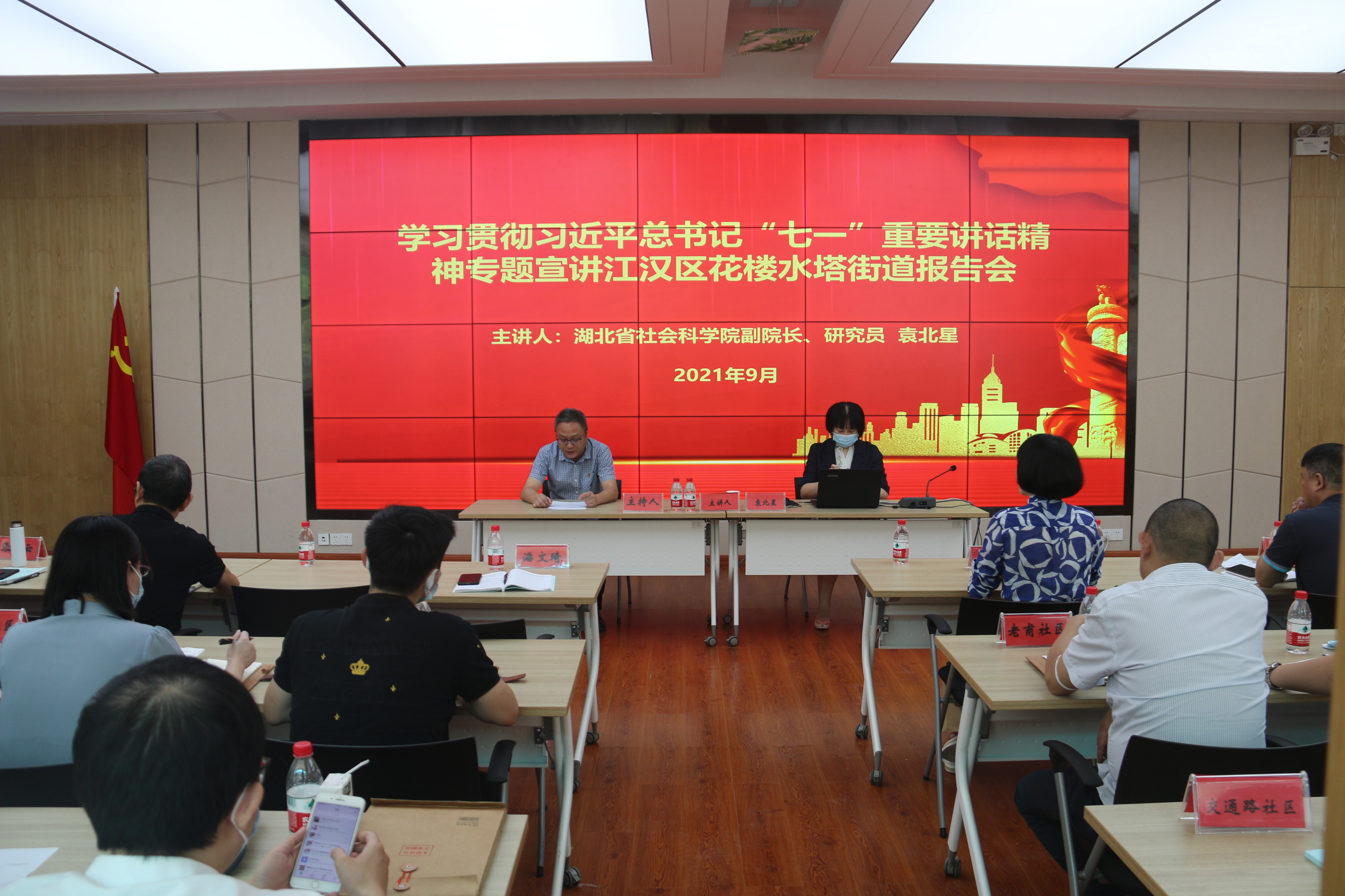 2021年9月9日上午,学习贯彻习近平总书记“七一”重要讲话精神专题宣讲江汉区花楼水塔街道报告会在花楼水塔街前进社区二楼会议室举行,深入学习贯彻习近平总书记在庆祝中国共产党成立100周年大会上的重要讲话精神,湖北省社科院副院长、研究员、湖北省党史学习教育省委宣讲团成员袁北星作专题宣讲报告。