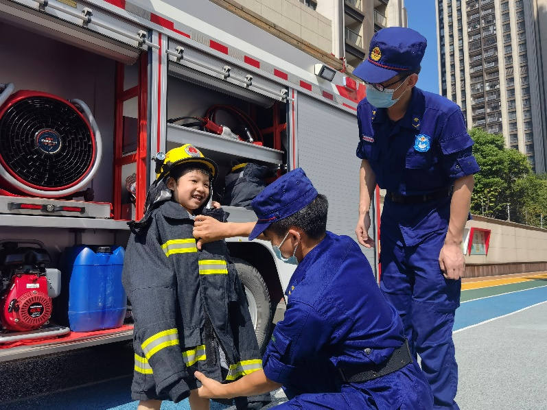 消防站的消防官兵结合近年来发生的典型火灾事故,生动阐述了发生火灾后的安全疏散与逃生知识、火灾引发的严重后果以及消防工作的特殊性和重要性,还向在场的小朋友和老师们展示了消防器材和装备,冒着30多度的高温现场穿戴全套着装,老师和小朋友们一起鼓掌向消防员致敬。小朋友们叽叽喳喳兴奋极了,在台下纷纷举手向消防员叔叔提问:“消防员叔叔这个是什么?那个怎么使用啊?我以后可以当消防员吗?”消防员邀请小朋友们坐上消防车体会了一把当消防员的瘾,还穿上了消防服,神气极了,坐在消防车上向大家招手示意。