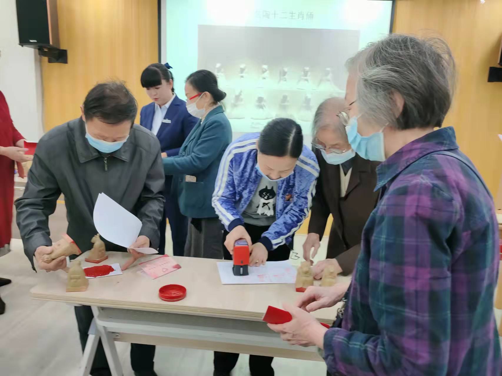 此次室内课程《灵动方寸间——探寻印章的奥秘》主要从印章的起源、名称、形状、材质、印文等方面来进行介绍,课后讲解员还向学员们展示了武汉博物馆原创的十二生肖古风汉服趣味印章,深受学员们的喜爱,现场热火朝天,好不乐乎。