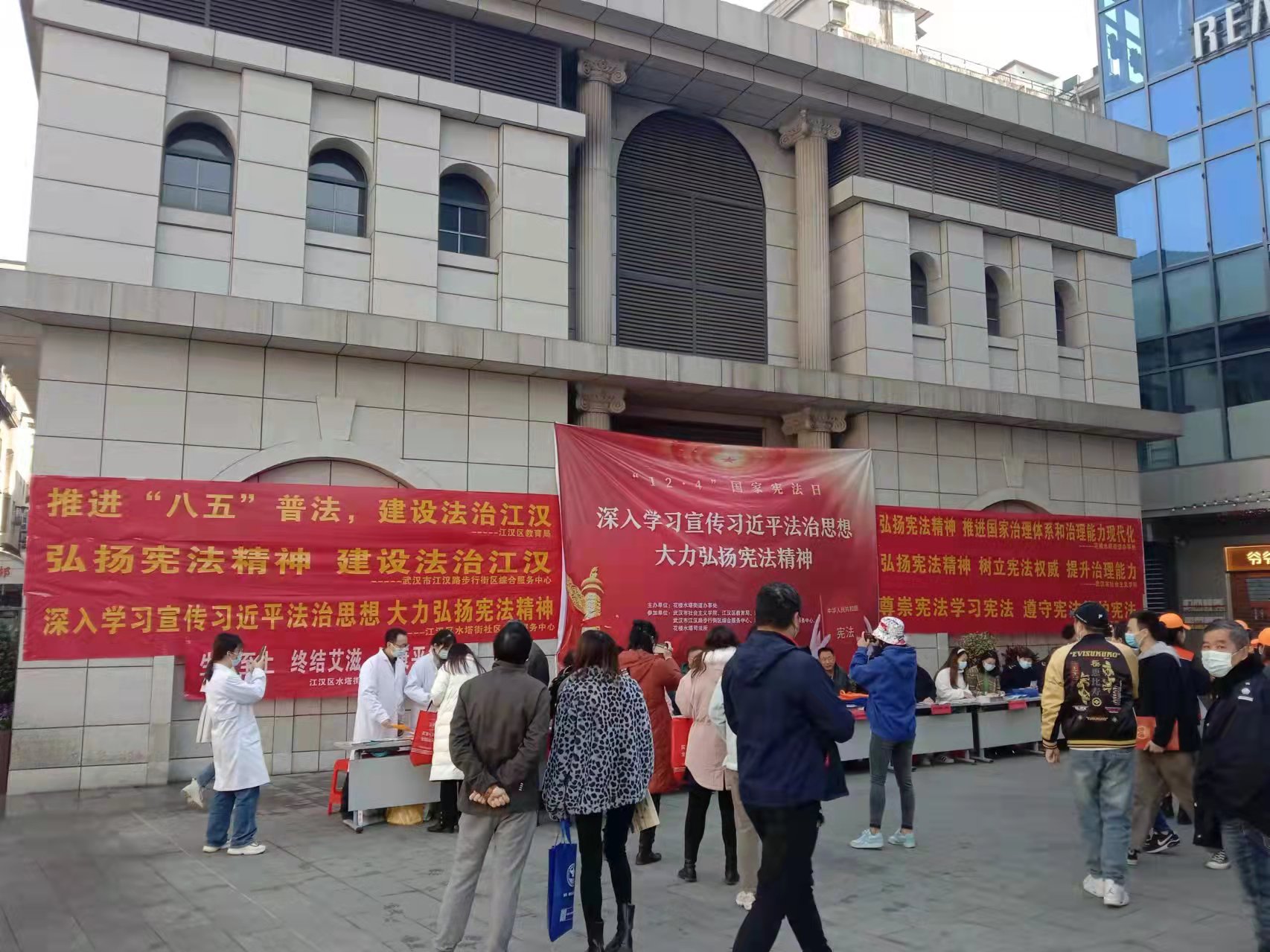 12月3日上午,江汉路步行街区综合服务中心积极参与花楼水塔街道办事处开展的以“深入学习宣传习近平法治思想 大力弘扬宪法精神”为主题的国家宪法日集中宣传活动。活动地点设在江汉路九通卡广场处,各单位干部通过现场答疑、移动讲座、悬挂宣传标语、发放宣传手册的方式,向大家宣讲宪法、民法典、治安管理、城管禁毒法、禁毒等方面法律常识。